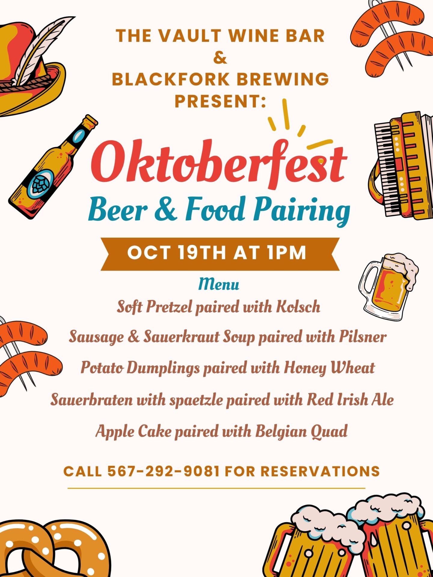 Find out moreOur first collaboration with Blackfork Brewing is an Oktoberfest food menu paired with Blackfork Brewing beers! $49 a person and reservations are required. Call 567-292-9081 to get signed up!